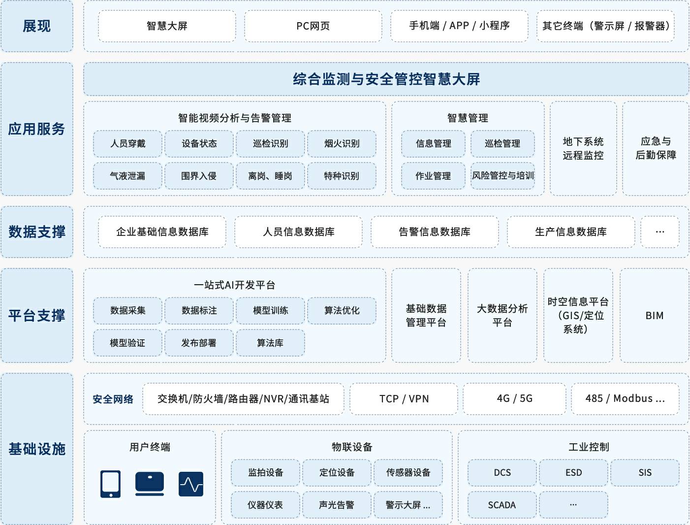 针对矿山安全生产的管理要求,紧抓需求痛点,恒峰g22官网首页-恒峰(中国)创新提出“一基础、双支撑、多平台、N应用”的智慧矿山方案,实现不同阶段需求逐步实现未来智慧矿山。恒峰g22官网首页-恒峰(中国)创新充分利用人工智能算法优势,从智能视频分析风险隐患切入,实现风险隐患全生命周期分析与管理,同时应用智慧化作业流程、智慧检维修提升作业生产效率,应急与后勤保障是重中之重,除了实现地下通风系统、定位系统、电力系统、通讯系统、排水系统以及环境监测系统的全天候监控之外,应急物资管理系统保障物资及时可用,人员设备定位系统保障下井人员位置的实时管控,充分实现应急后勤保障,恒峰g22官网首页-恒峰(中国)创新智慧矿山方案永远将安全生产放在第一位。